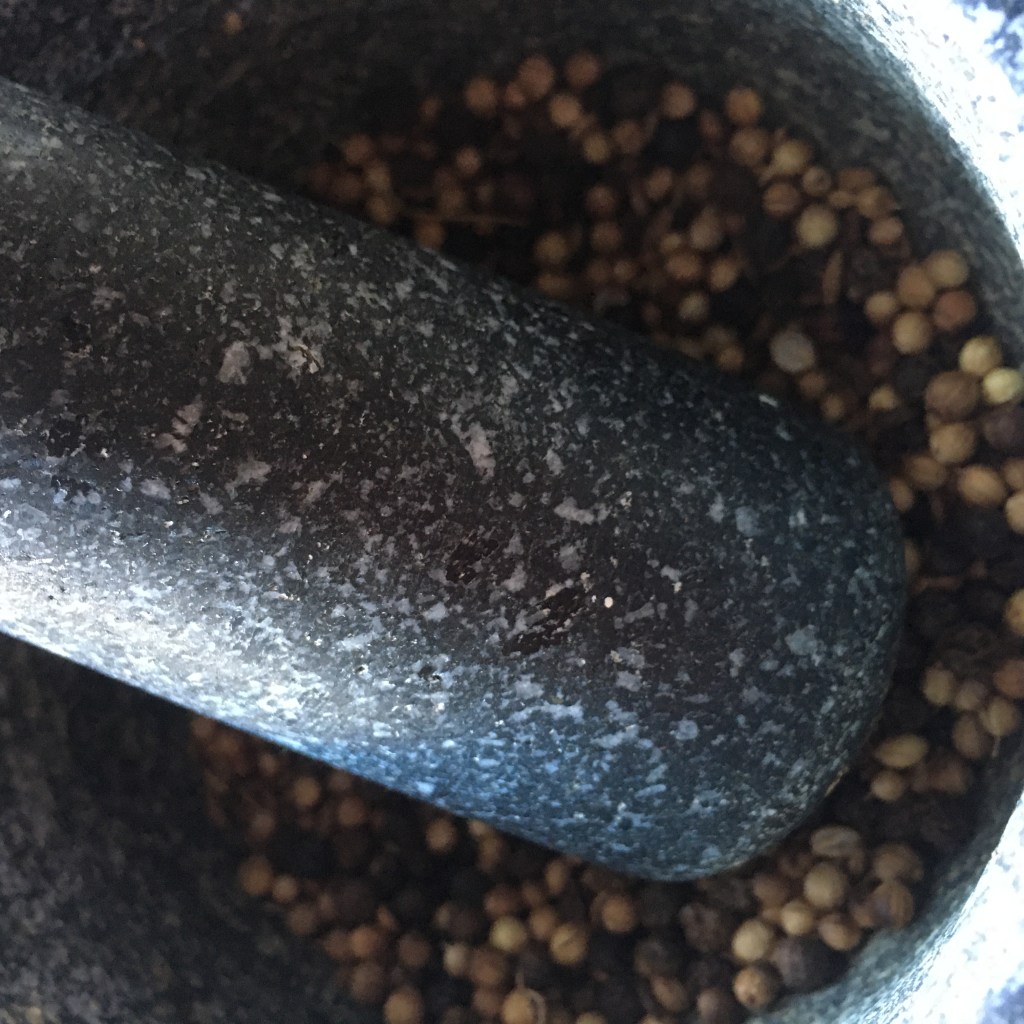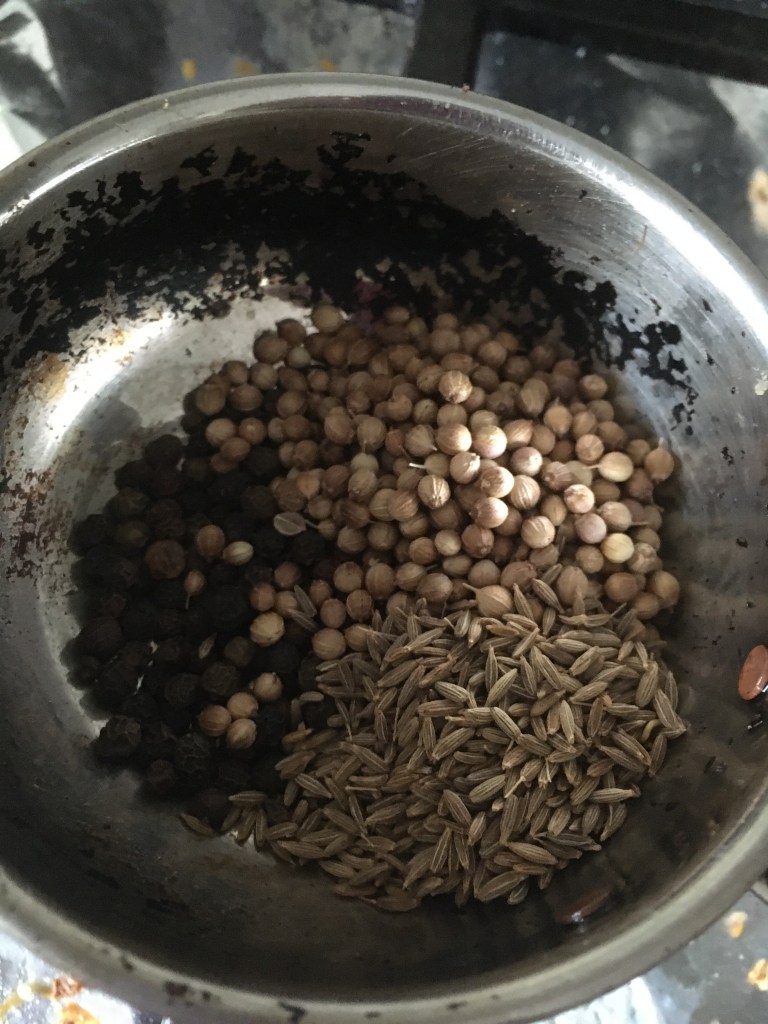 Dry roast the coriander seeds, pepper and Cumin and set aside to cool